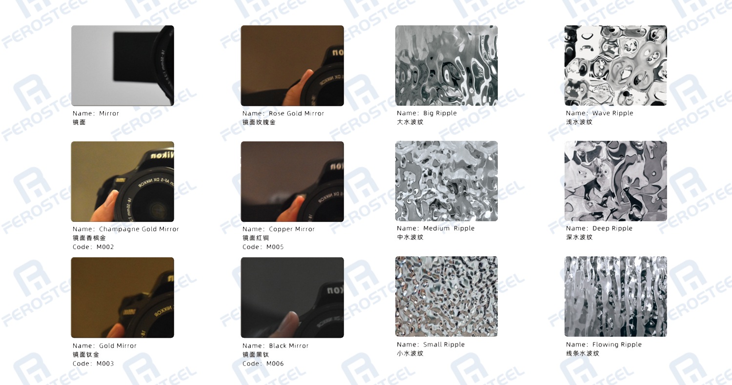Mirror, hairline, PVD gold/black, water ripple, and etched bronze are among the most widely used finishes.