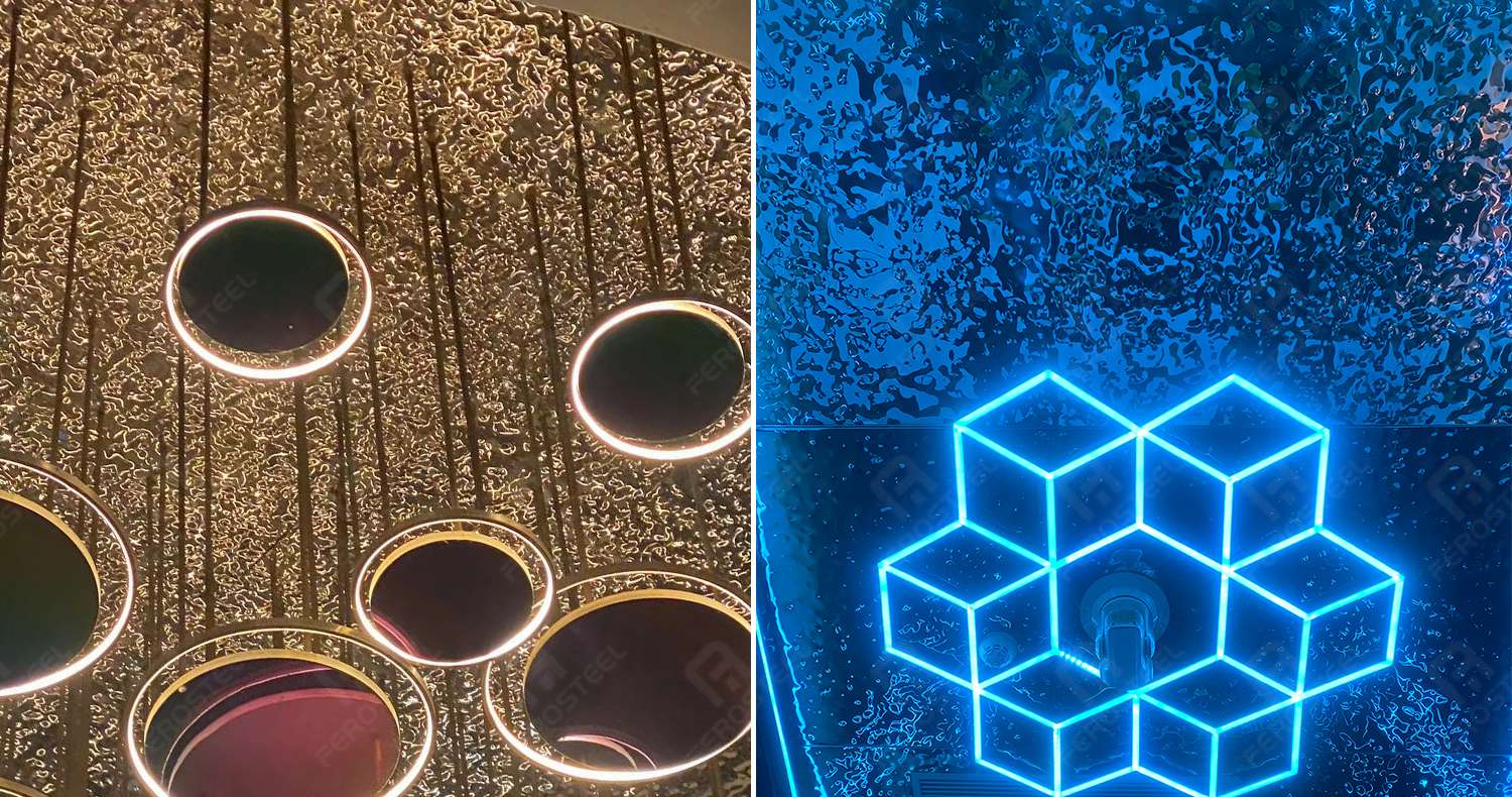 La textura ondulada de las láminas de acero inoxidable con efecto agua realza la profundidad y la dimensionalidad de cualquier diseño. Además, las propiedades reflectantes de la superficie crean efectos de luz dinámicos, convirtiéndola en un elemento atractivo, ya sea como revestimiento de paredes, paneles de techo o superficies de muebles.